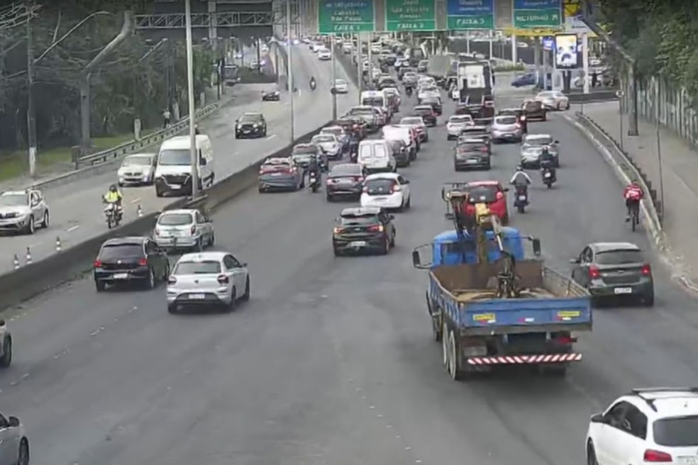 Um acidente envolvendo um ônibus, um carro e uma motocicleta interditou duas faixas da Avenida Ayrton Senna da Silva, em Praia Grande, no litoral de São Paulo, nesta segunda-feira (28). Segundo a prefeitura, o motociclista ficou ferido.