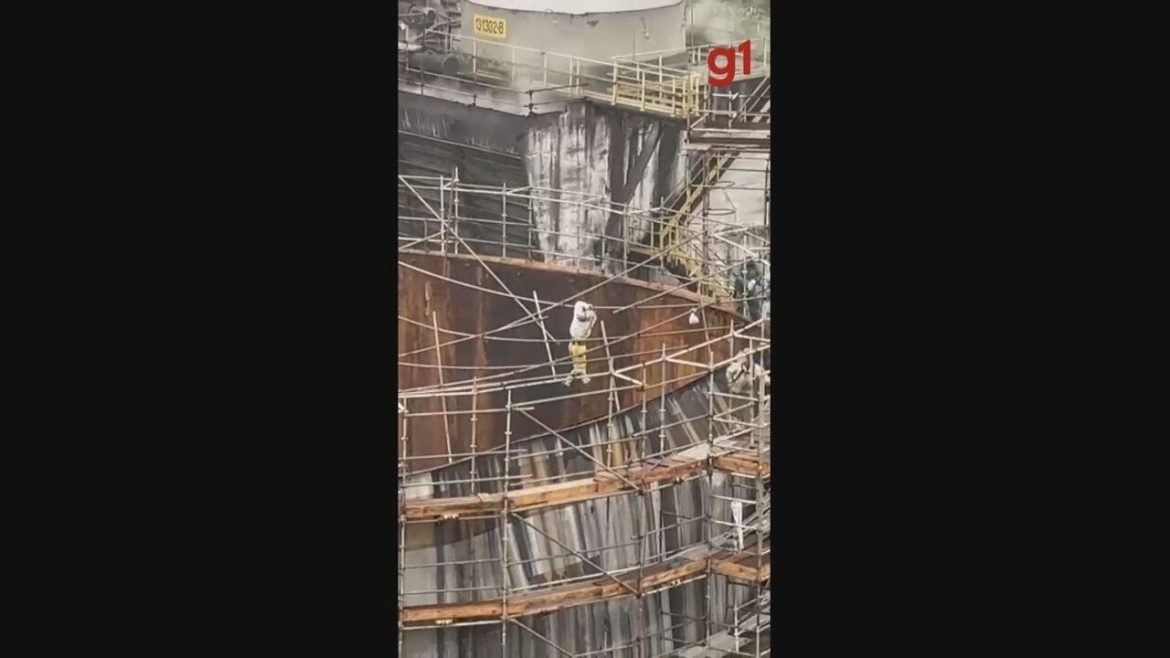 Dois trabalhadores ficaram pendurados em um andaime durante a reforma de um tanque industrial em Cubatão (SP) na última quarta-feira (2). O acidente ocorreu enquanto eles prestavam serviço para uma empresa contratada pela CMOC Brasil, que atua na produção de produtos químicos e fertilizantes. O incidente foi provocado pelo desabamento da cobertura do tanque, e as imagens obtidas pelo g1 mostram os funcionários suspendidos pelos Equipamentos de Proteção Individual (EPIs) na estrutura.