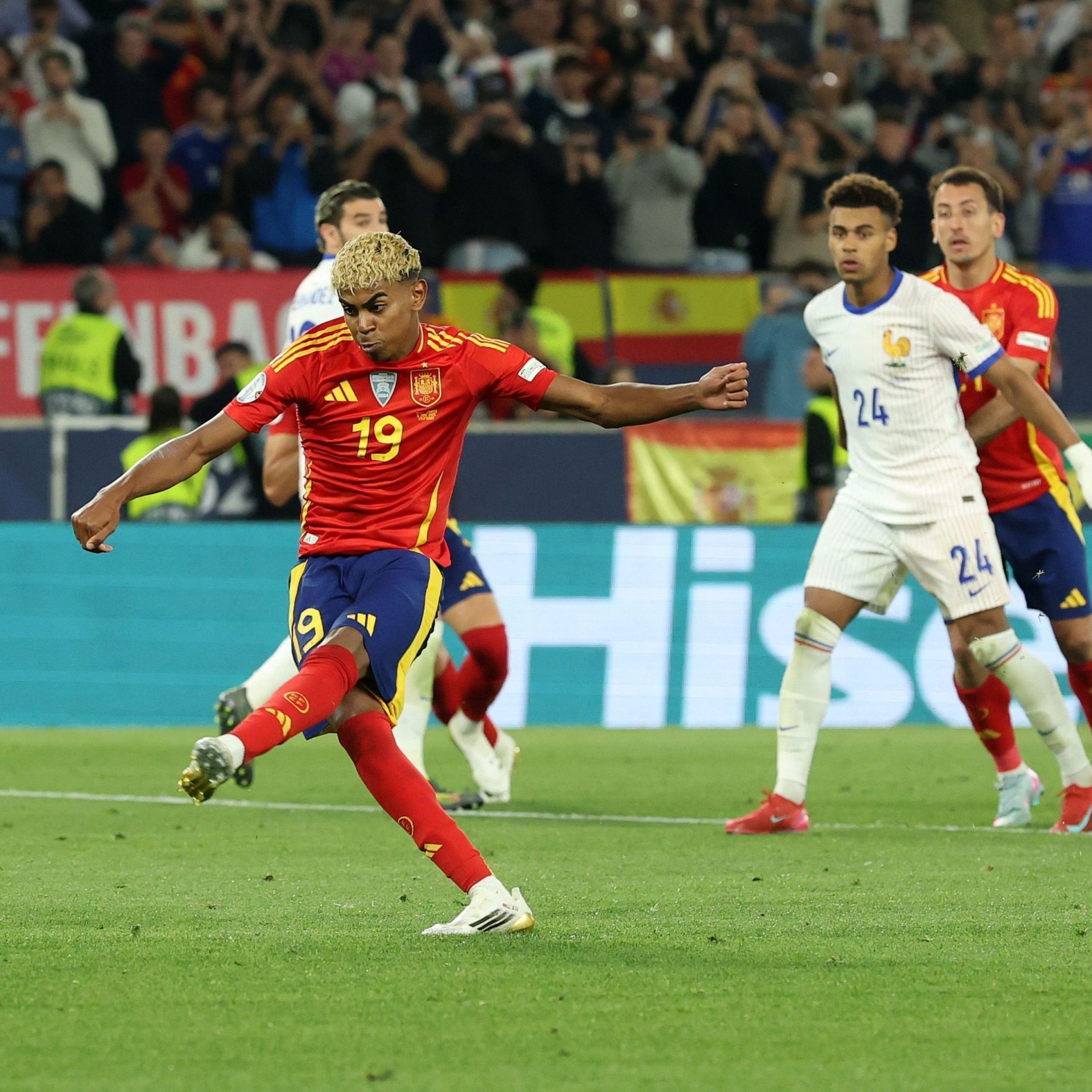 Lamine Yamal cobra pênalti para marcar um dos gols da Espanha sobre a França