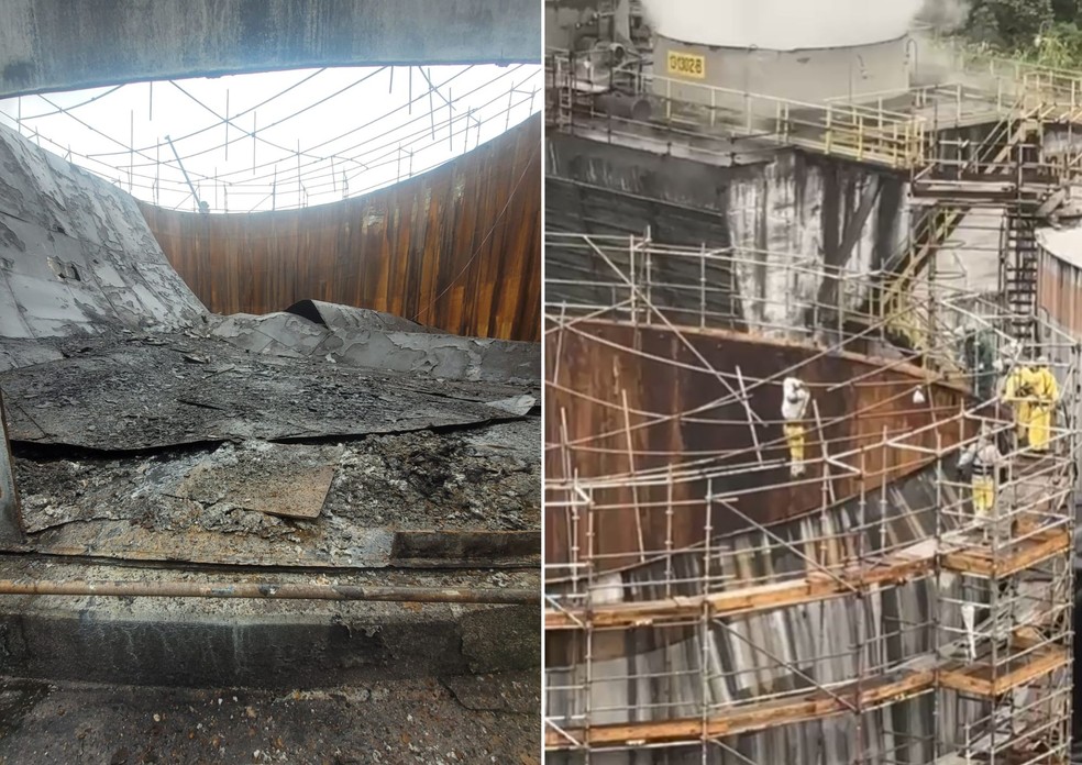 Dois homens ficaram pendurados em um andaime enquanto trabalhavam na reforma de um tanque industrial em Cubatão (SP). Conforme apurado pelo g1, parte da estrutura cedeu durante os serviços. Apesar do susto, ninguém se feriu.