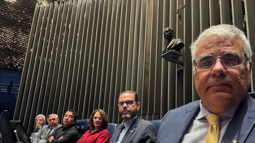 No início desta tarde, o senador Eduardo Girão (Novo-CE) publicou uma foto em que aparece sentado na mesa da Presidência da Casa ao lado dos também senadores Magno Malta (PL-ES), Damares Alves (Republicanos-DF), Jorge Seif (PL-SC), Izalci Lucas (PL-DF) e Jaime Bagattoli (PL-RO).