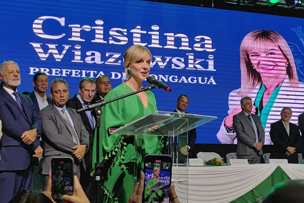 A prefeita eleita de Mongaguá, Cristina Wiazowski (Progressistas), e o vice Julio da Imobiliária (PDT), tomaram posse nesta sexta-feira (11). A cerimônia ocorreu por volta das 18h, na Praça Dudu Samba, durante o 20º Festão na Praia – Festival de Inverno do Empreendedor, que reúne atrações culturais, feira de negócios, gastronomia regional, palestras e atividades voltadas ao fortalecimento de empreendedores locais.