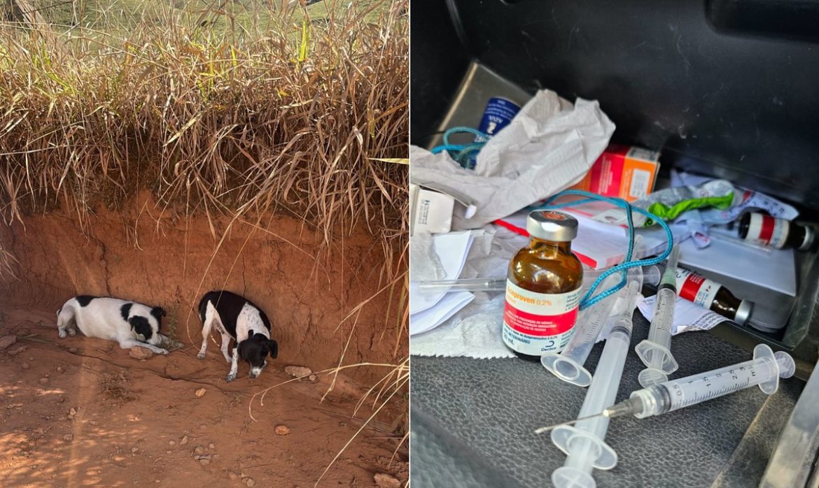 Quando foi flagrado, os suspeitos estavam uniformizados e usando uma viatura oficial, informou a Polícia Civil. Eles estavam colocando os cachorros no automóvel. Foram encontrados com o grupo seringas e frascos de sedativos.