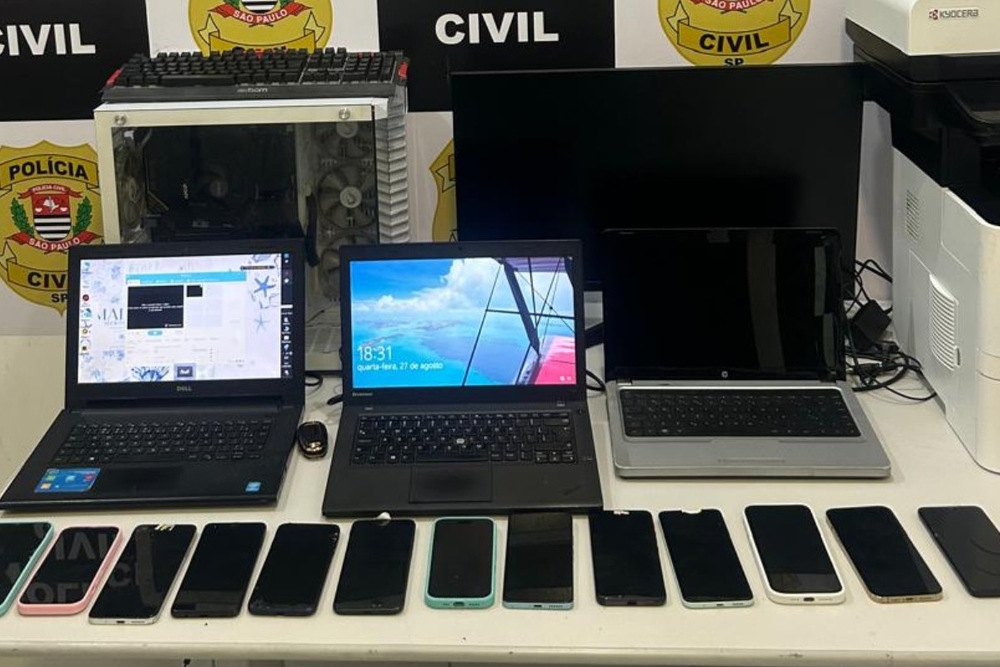 Além do carro, os policiais apreenderam 14 celulares, um computador, um monitor e três notebooks, que serão periciados. O caso foi registrado como cumprimento de mandado de busca e apreensão, estelionato, organização criminosa e apreensão de veículo na DIG de Praia Grande, onde segue sob investigação.